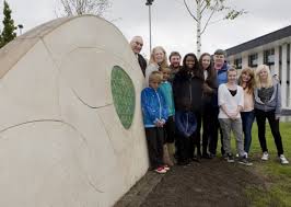 The roundabout feature serves as a distinctive and colourful visual gateway. A landform was created with five identical organic shaped motifs, similar in form that connect the business college and the learning centre. The shapes are carved and have inlayed stove enamelled designs.